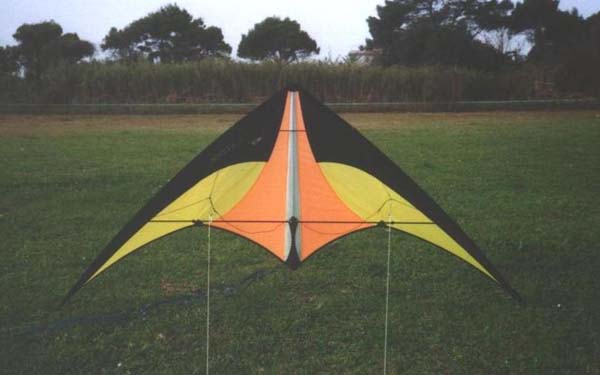 168 cm. 90 cm. 145 g. Carbonio da 5mm. cavo Nylon ripstop + Mylar 3 rami semplice Medio Coramide/Dyneema da 38 a 50 Kg - da 20 a 40 Mt. Molto reattivo e veloce con discreta trazione. E' un aquilone che perdona poco gli errori e da il meglio di se con vento medio anche se si riesce a farlo volare anche con vento leggero. Con vento pił sostenuto diventa velocissimo. |