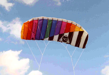225 x 75 cm. 220 g. Assente - Paraflex floscio. Nylon ripstop camberata. 2 cavi. Leggero - Medio Coramide 110 Kg x 30 mt. su barra. Agile con buona trazione e manovrabilità. Molto divertente da usare anche con vento leggerissimo. E' stabile e facile da pilotare. Con vento sostenuto diventa più impegnativo per via della trazione consistente. |